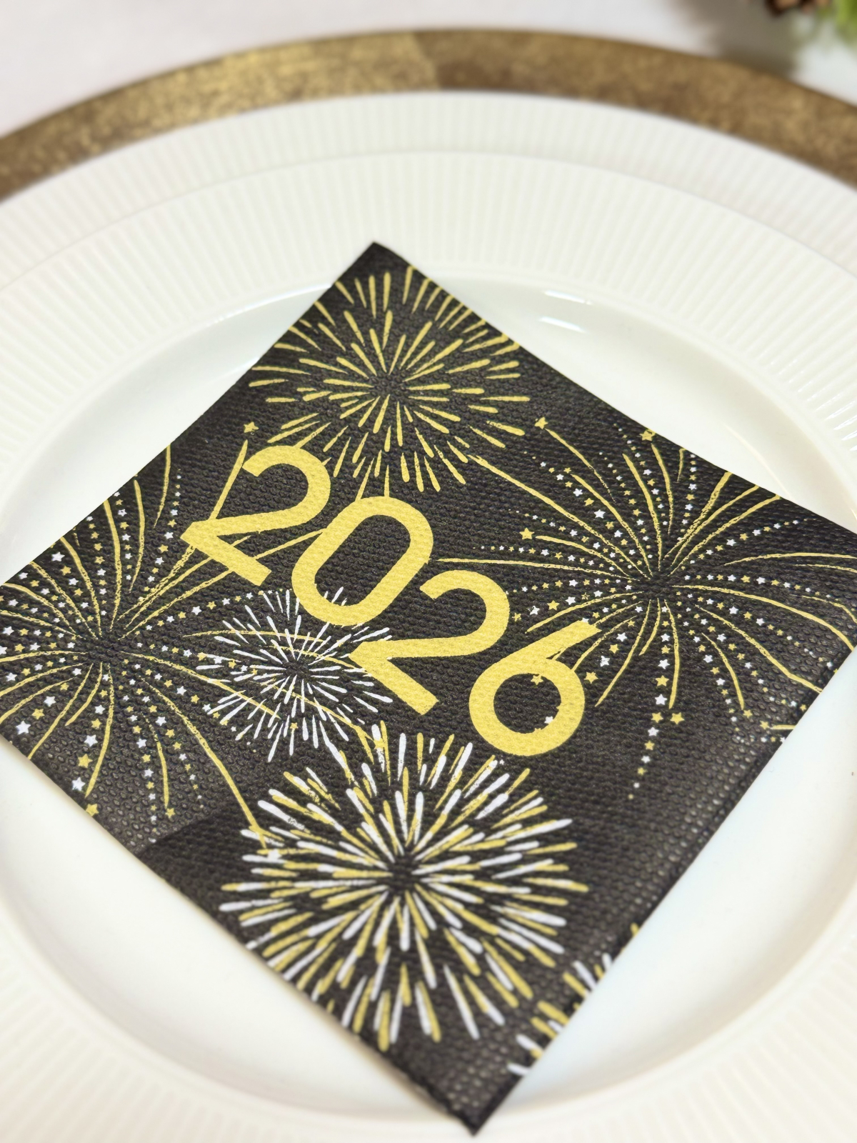 Șervețele festive pentru Revelion, cu imprimeu cu artificii și inscripția 2026 în centru — perfecte pentru a întâmpina noul an cu stil.