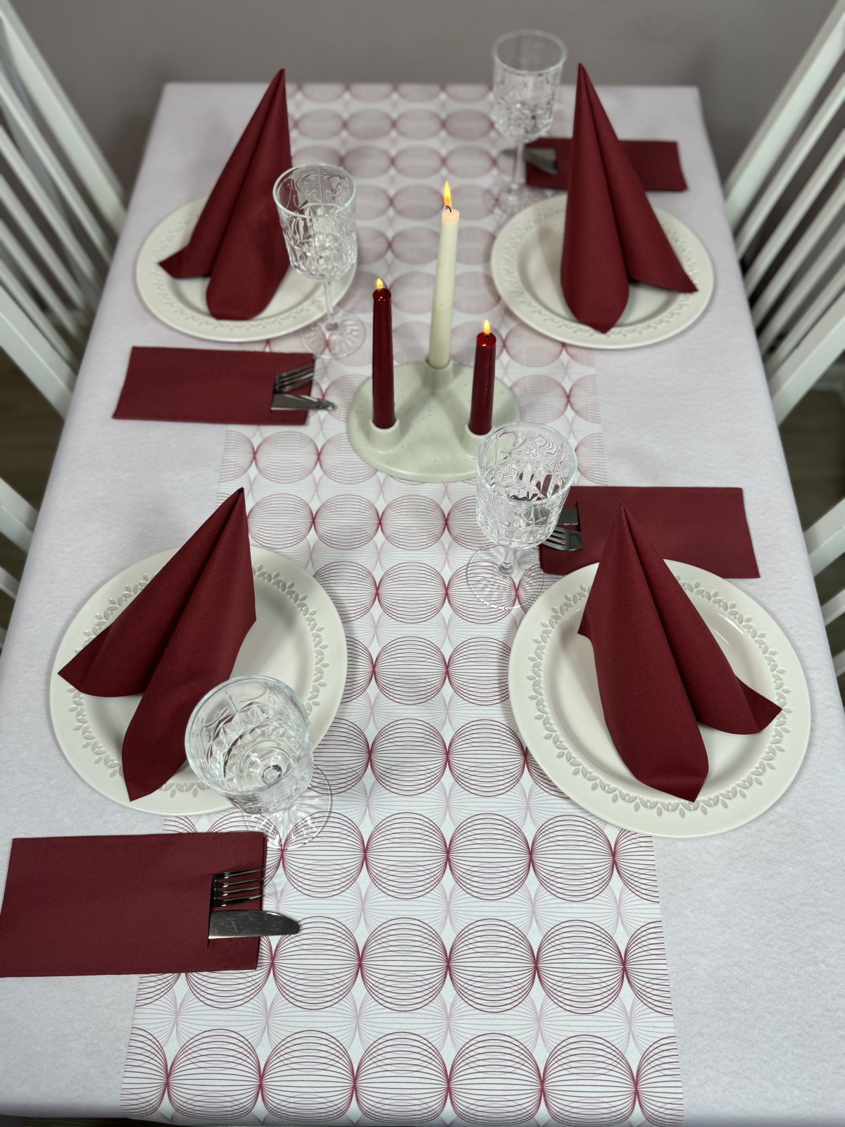 Traversa de masă Linclass Ludo, cu imprimeu roz-bordo, rolǎ 24m, idealǎ pentru petreceri aniversare.